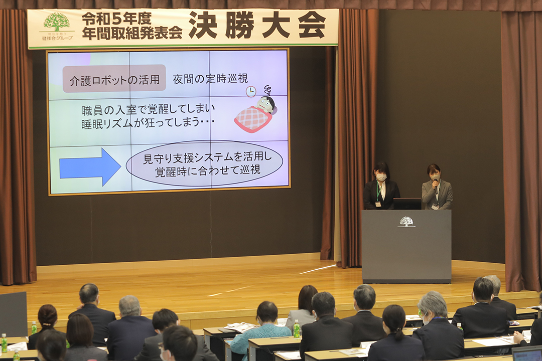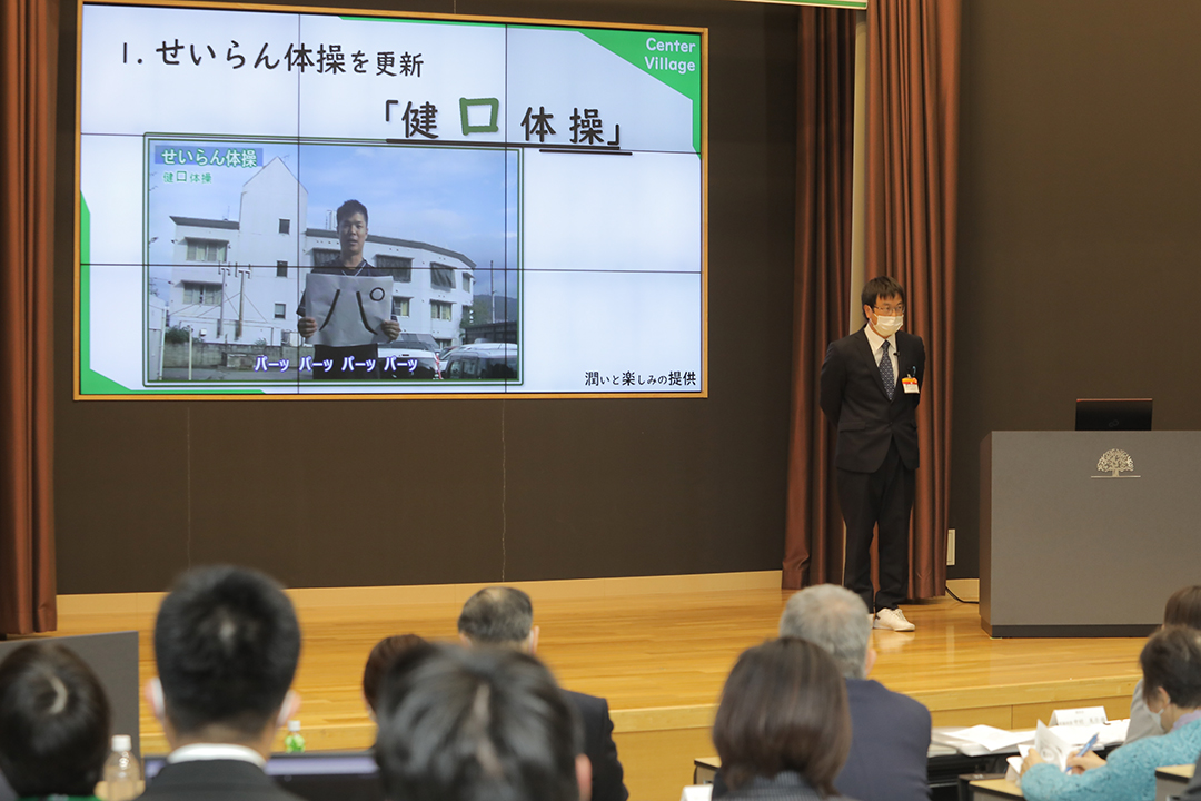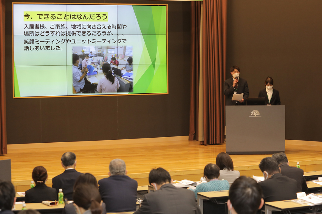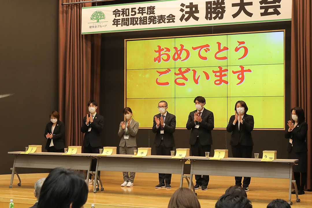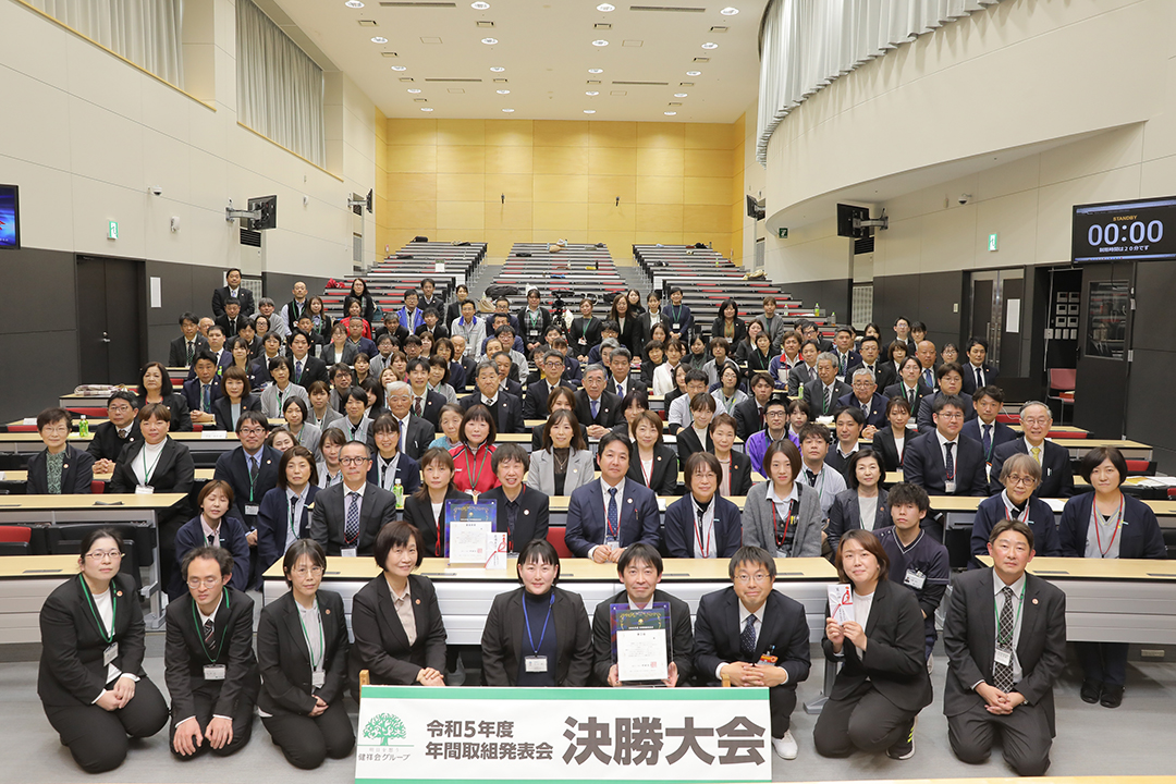 利用者様によりよい介護をお届けするために、また、現場の士気と意欲を高め、介護の楽しさ、やりがい、誇りを職員みんなで共有するために、健祥会グループのすべての高齢者施設と身体障害者施設では毎年統一テーマに沿った取り組みを実践しています。1年間取り組んだその成果を報告しあい評価しあうのが「年間取組発表会」(本部経営戦略推進部、施設サービス力向上委員会、在宅サービス力向上委員会、食・栄養向上委員会主催)。事前に行われる施設種別ごとの5会場での予選を勝ち抜いた7施設が、健祥会トゥモローホールで開催される令和5年度の決勝大会に臨みました。