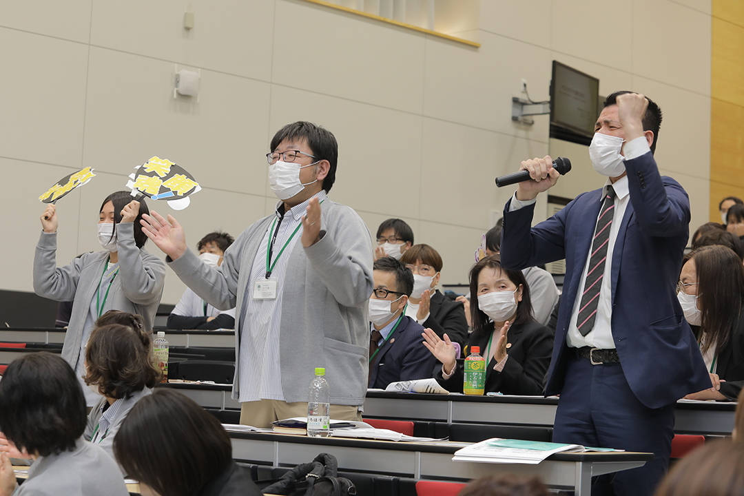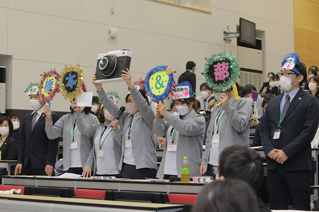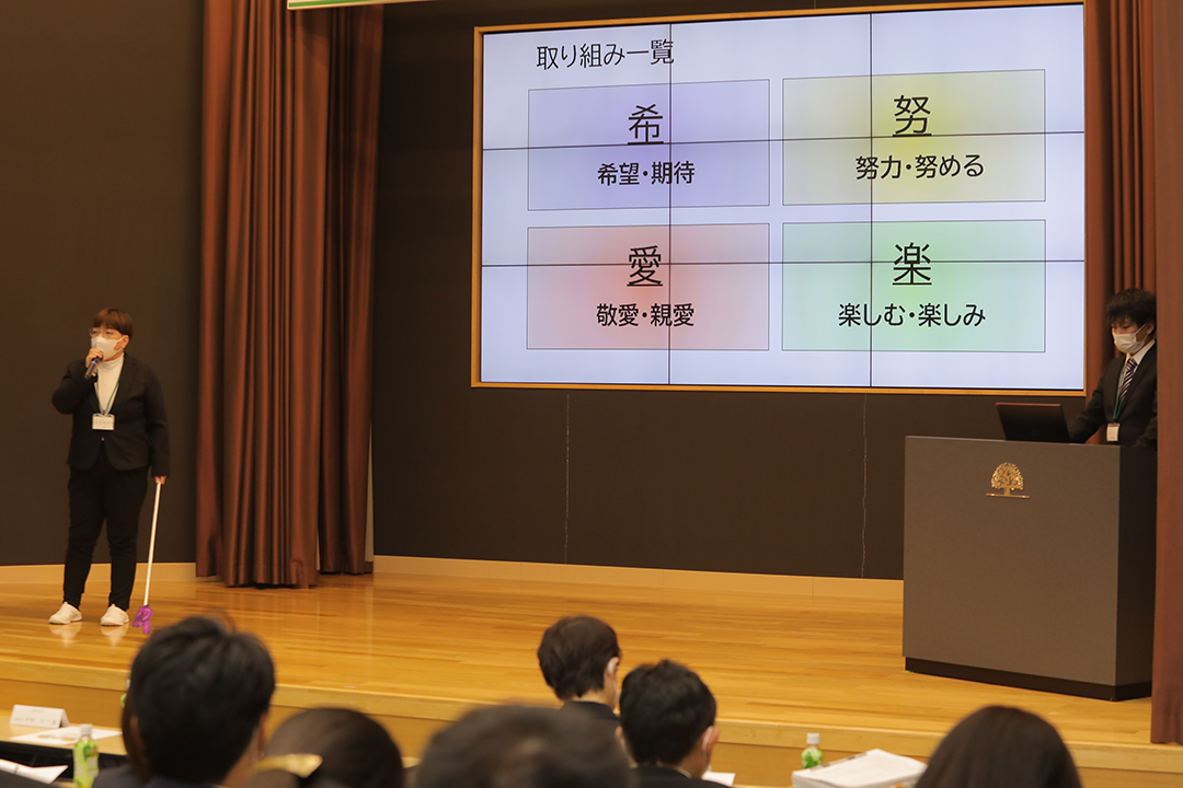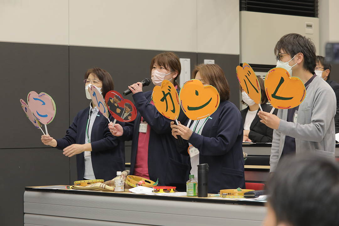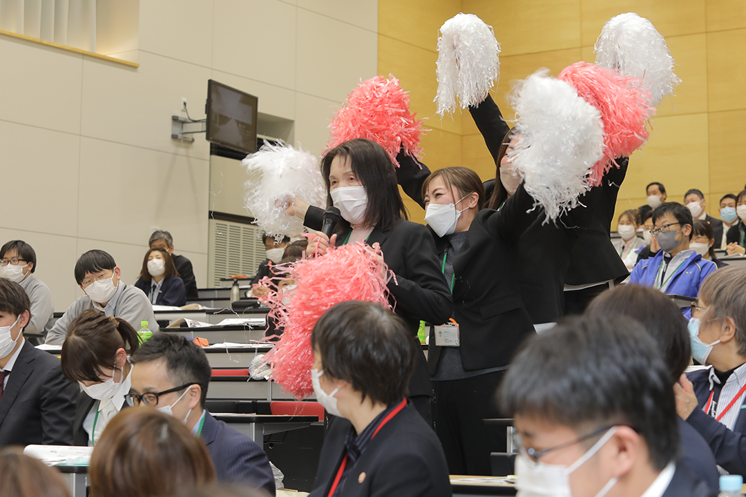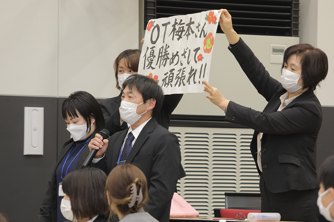 利用者様によりよい介護をお届けするために、また、現場の士気と意欲を高め、介護の楽しさ、やりがい、誇りを職員みんなで共有するために、健祥会グループのすべての高齢者施設と身体障害者施設では毎年統一テーマに沿った取り組みを実践しています。1年間取り組んだその成果を報告しあい評価しあうのが「年間取組発表会」(本部経営戦略推進部、施設サービス力向上委員会、在宅サービス力向上委員会、食・栄養向上委員会主催)。事前に行われる施設種別ごとの5会場での予選を勝ち抜いた7施設が、健祥会トゥモローホールで開催される令和5年度の決勝大会に臨みました。