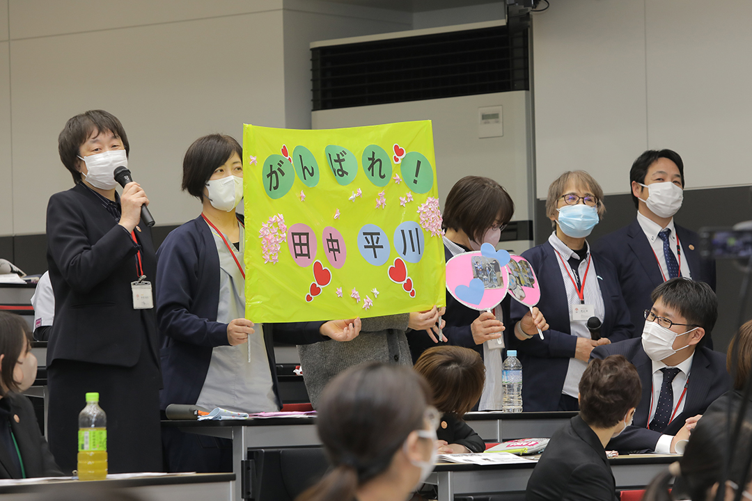 当日、7施設の発表者と応援団が満を持してトゥモローホール入り。常務理事中村晃子、専門学校健祥会学園校長武田英二をはじめ、グループ本部の管理職、ステージリーダーら審査員の前での発表の模様は全施設にライブ配信されました。