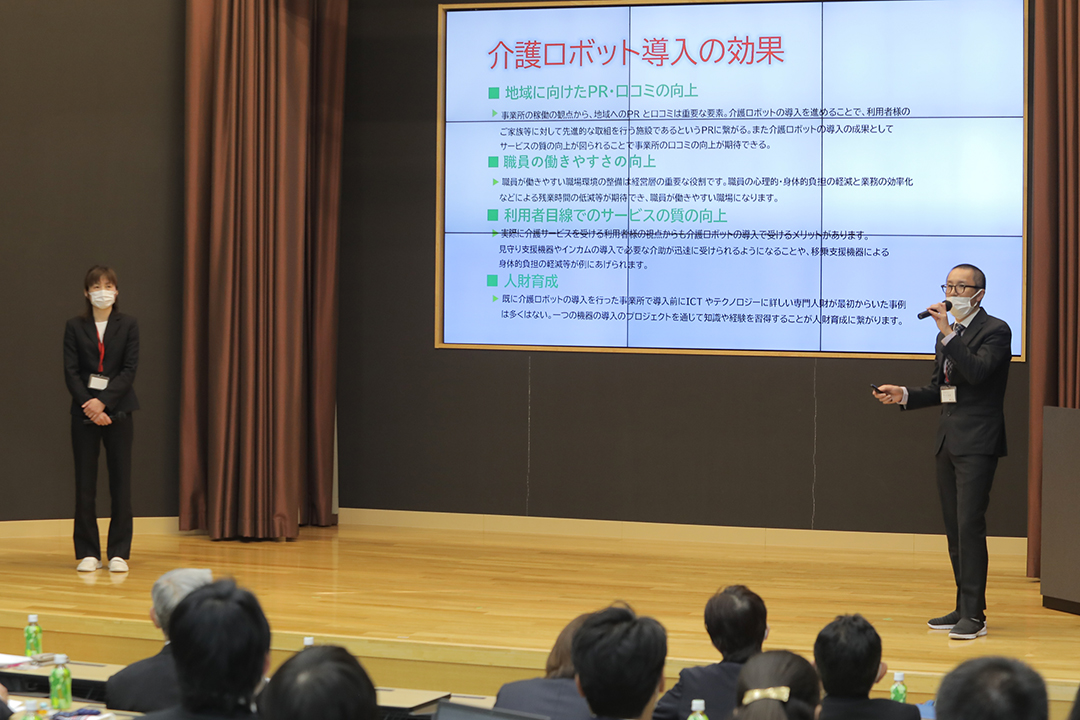 介護ロボット・ICT機器の普及・活用を図ることで、利用者様・ご家族、ひいてはグループ全体への貢献も果たしたいという意欲のもと、DX推進チームを発足。職員への意識調査にはじまり、他法人見学、デモ機の導入・体験・学び、そして検証、施設ブログでの取り組みPRなど、定めた目標へ向かってきっちりと取り組んでいた結果、施設全体の意欲の高まり、スマート介護士資格取得、メーカーからの実証実験依頼にもつながった。生産性アップの鍵は、職員が笑顔で活用すること。それが利用者様の笑顔も連れてくる。悪しきは失敗することではなく、何も考えず何もしないこと。同時に、情報発信の大切さを学んだ。