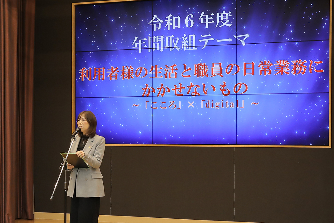 令和6年度のテーマは、利用者様の生活と職員の日常業務にかかせないもの~「こころ」×「digital」~です。健祥会グループはICT機器や介護ロボットなどを先駆的に導入してはいますが、まだまだ発展途上。試行錯誤の段階であり、使いきれていないのが現状です。そして、今後よりよいサービスを作っていく上で、「こころ」と「デジタル」の両輪は必須です。今日の発表の中にもデジタルの活かし方について参考になるものがたくさんありましたので、しっかり自施設の取り組みに取り入れてほしいと思います。