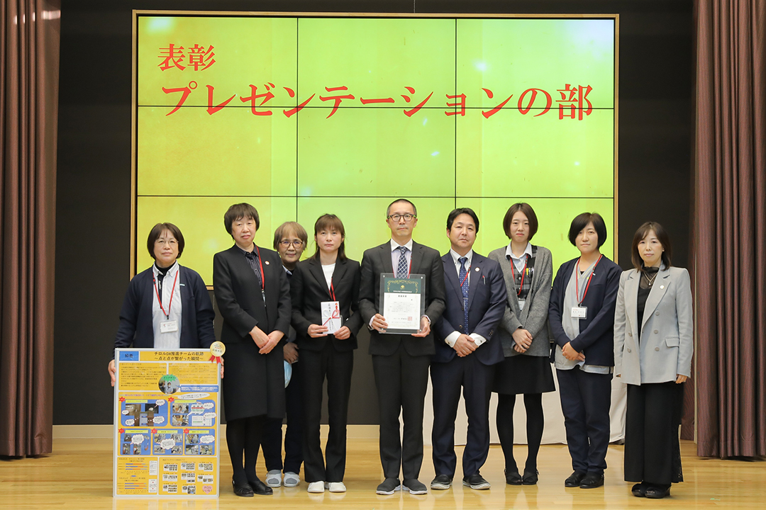 社会福祉法人緑風会・青嵐会評議員 西山惠子氏、社会福祉法人緑風会監事 佐藤茂夫氏、専門学校健祥会学園校長 武田英二よりの講評に続いて、表彰式が行われ、常務理事中村晃子より、受賞チームに表彰状と賞金が贈られました。