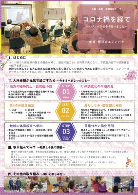 コロナに負けない生活とは、入所者様も職員も元気に暮らす・働くこと。そのために、入所者様に対しては、せいらん体操の更新、農園の開設、いきいきたいむ(地産地消の時間)などで、潤いと楽しみを創造し生活の質を上げる。職員へは、一人ひとりの働く力を磨き、新しいものを生み出す力を身につけることをめざし、働き方改革を推進。腰痛予防体操の習慣化、介護ロボットやICTの活用、業務負担の平準化、次世代育成などに取り組んだ。入所者様・ご家族へのアンケートから未来をのぞくと見えてきた多様化個性化の流れに向かって、より個を大事にしたオンリーワンの次世代介護へ!