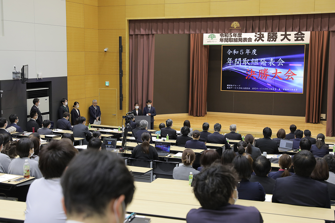 利用者様によりよい介護をお届けするために、また、現場の士気と意欲を高め、介護の楽しさ、やりがい、誇りを職員みんなで共有するために、健祥会グループのすべての高齢者施設と身体障害者施設では毎年統一テーマに沿った取り組みを実践しています。1年間取り組んだその成果を報告しあい評価しあうのが「年間取組発表会」(本部経営戦略推進部、施設サービス力向上委員会、在宅サービス力向上委員会、食・栄養向上委員会主催)。事前に行われる施設種別ごとの5会場での予選を勝ち抜いた7施設が、健祥会トゥモローホールで開催される令和5年度の決勝大会に臨みました。