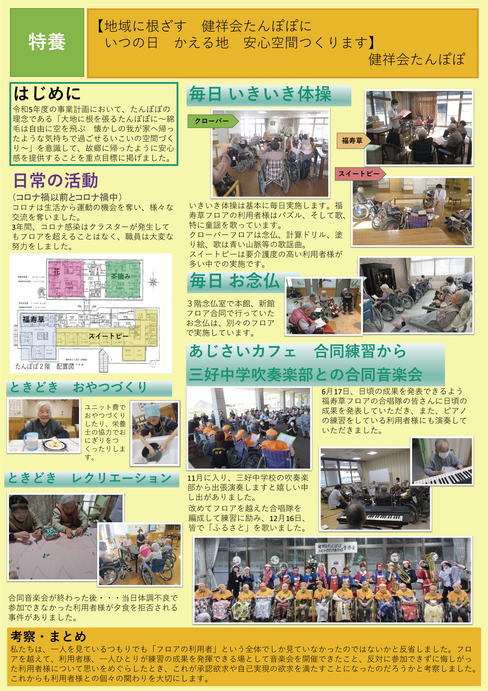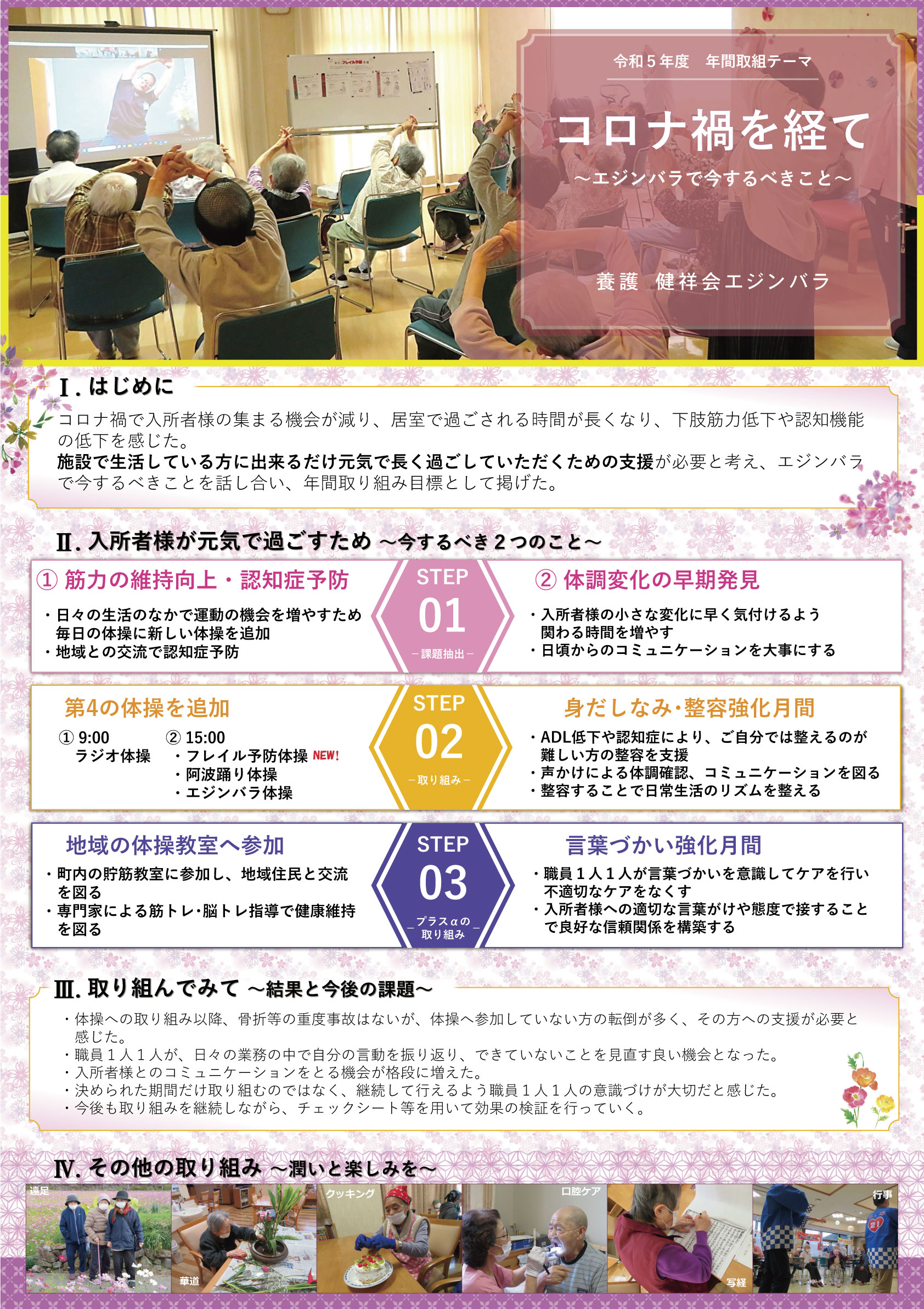 3年にわたるコロナ禍を振り返りつつ、検証しつつの令和5年度、感染症対策もしながら、難しいテーマへの取り組みだったと思います。現場では、私の想像の及ばぬほどの苦労であったと思いますが、この経験は必ず財産になっています。失われた4年間ではなく、これを糧として、施設は強くやさしくなれたはずです。利用者様やご家族の想いに心を馳せて、工夫し柔軟に取り組んだ経験を、施設力アップに繋げてください。