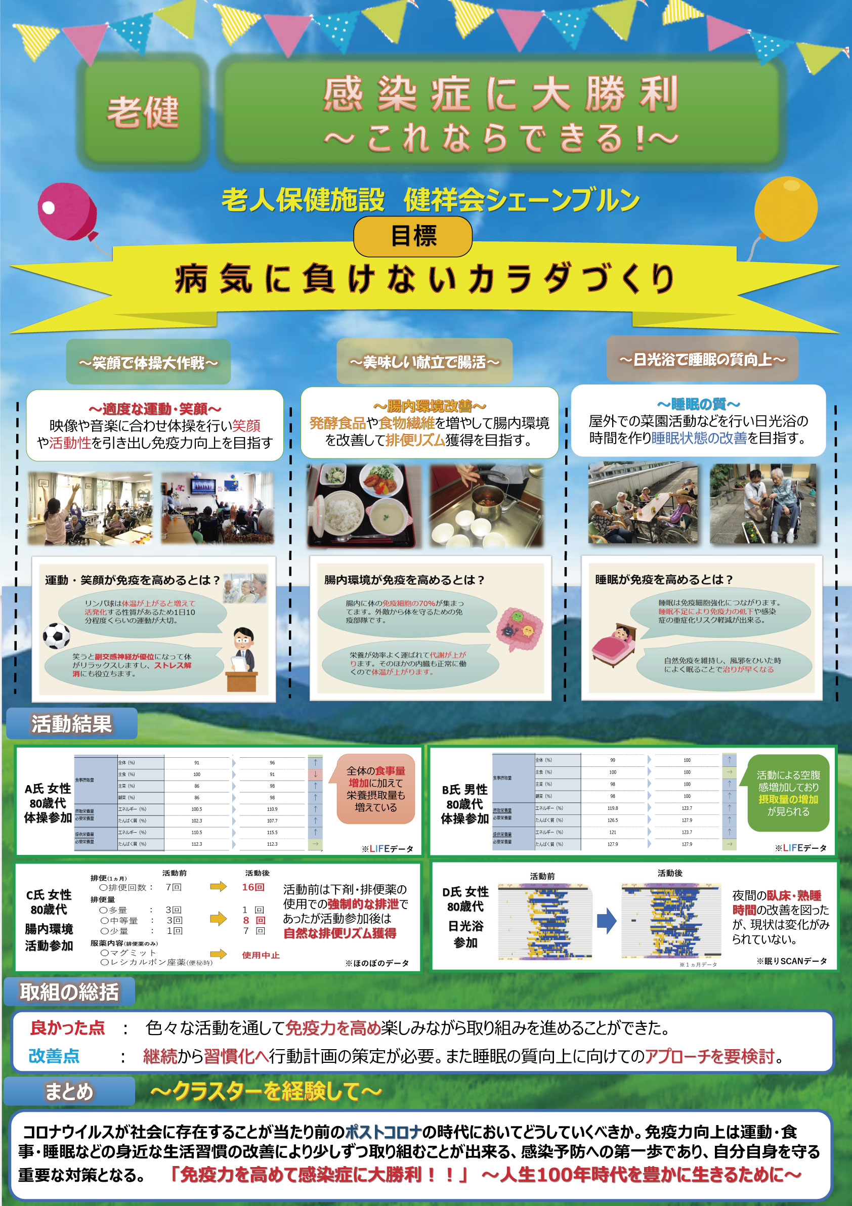 コロナに負けない生活とは、入所者様も職員も元気に暮らす・働くこと。そのために、入所者様に対しては、せいらん体操の更新、農園の開設、いきいきたいむ(地産地消の時間)などで、潤いと楽しみを創造し生活の質を上げる。職員へは、一人ひとりの働く力を磨き、新しいものを生み出す力を身につけることをめざし、働き方改革を推進。腰痛予防体操の習慣化、介護ロボットやICTの活用、業務負担の平準化、次世代育成などに取り組んだ。入所者様・ご家族へのアンケートから未来をのぞくと見えてきた多様化個性化の流れに向かって、より個を大事にしたオンリーワンの次世代介護へ!