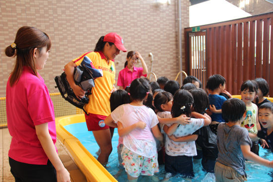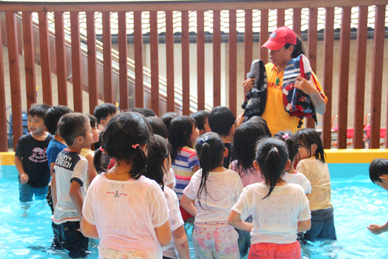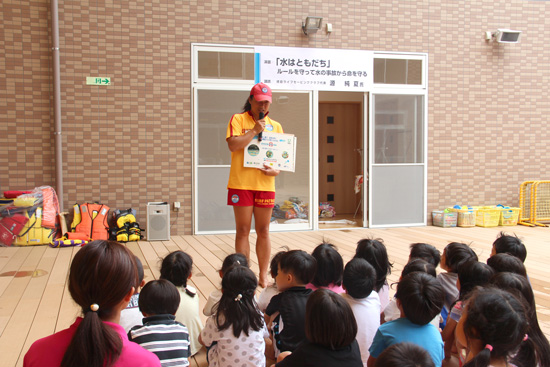 お話のタイトルは「水はともだち」〜ルールを守って水の事故から命を守る〜 参加した保育園の5歳児は、源純夏さんと一緒に安全について考えながら、ライフジャケットを身につけたり、着衣のままプールに入ったり。いつもとは違う水とのかかわりがとても興味深かったようで、笑顔と歓声いっぱいの賑やかな講習会となりました。