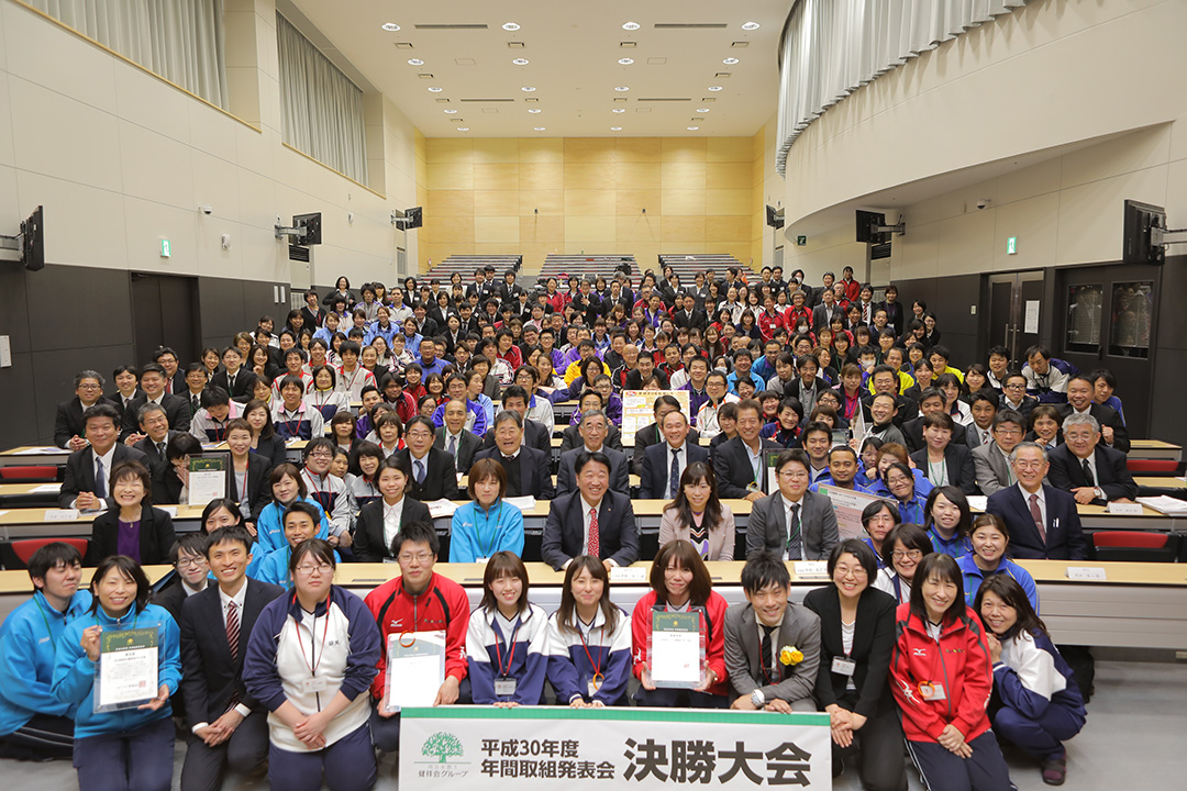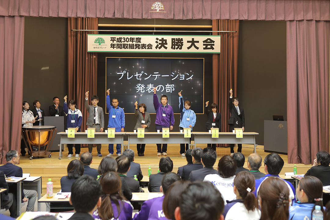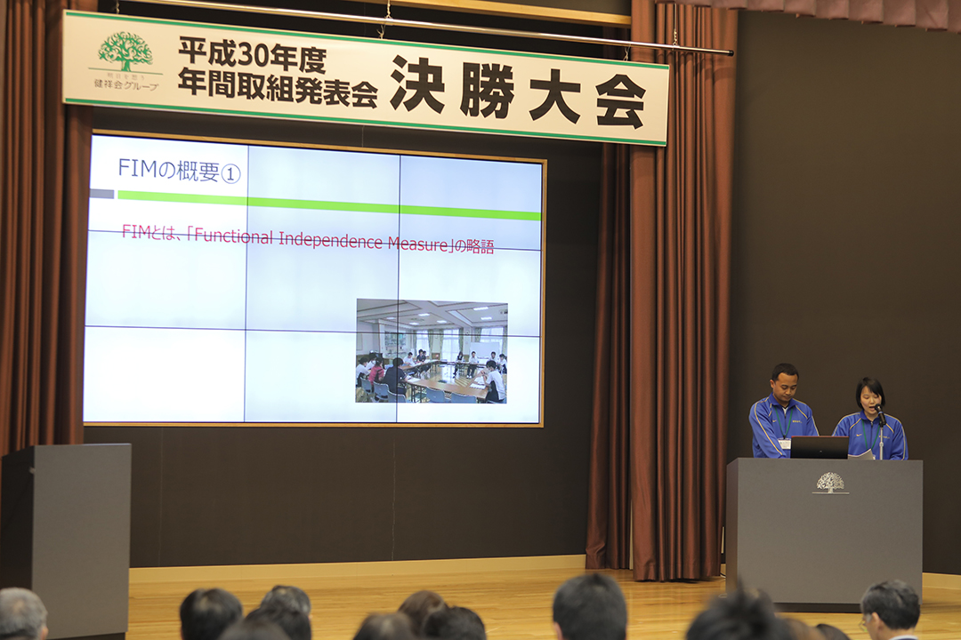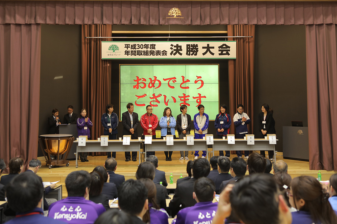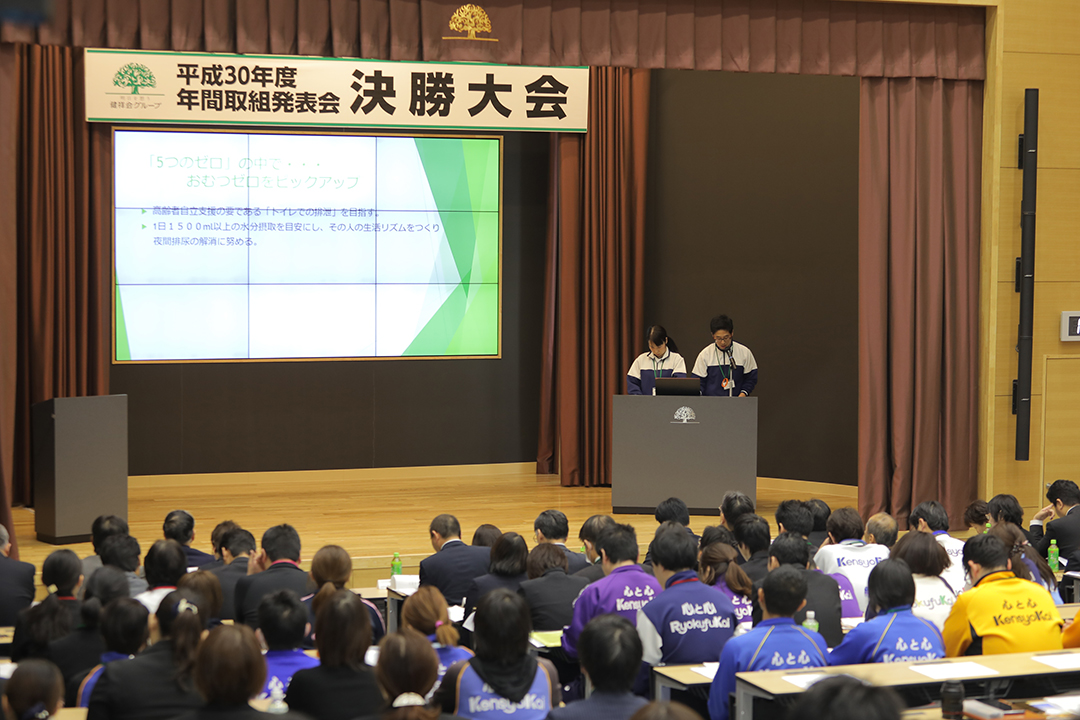 平成30年度の統一テーマは、「5つのゼロと4つの自立支援〜データ分析から利用者様の笑顔に〜」。種別ごと地区ごとに5会場で行われた予選を経て、勝ち残った8施設が健祥会トゥモローホールに集い、「平成30年度年間取組発表会決勝大会」が開催されました。