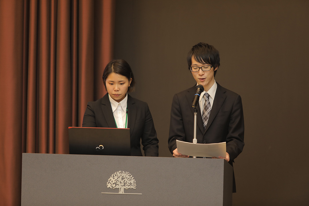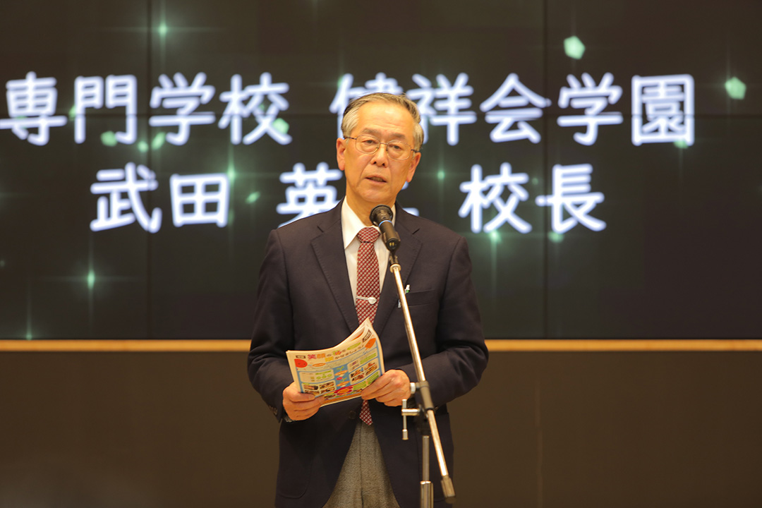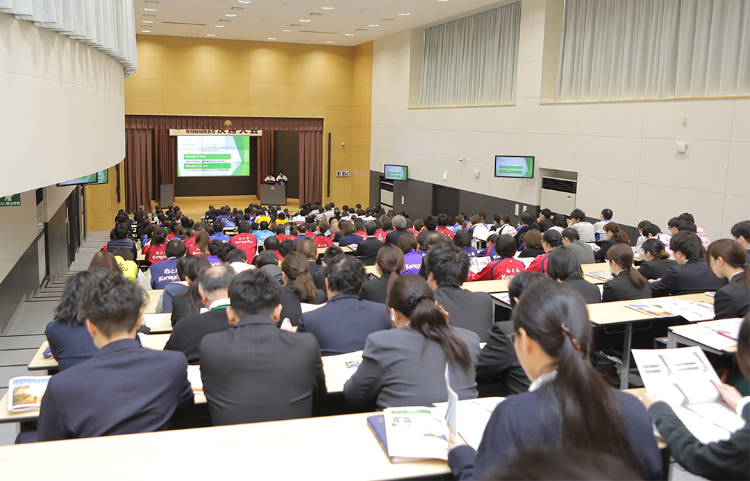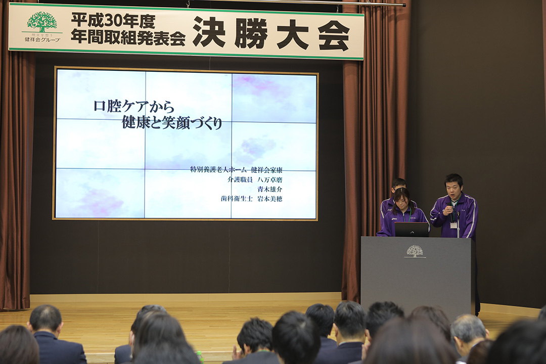 決勝大会進出を果たしたのは、グループホーム濃姫、特別養護老人ホーム緑風会イサベル、老人保健施設健祥会ウェル、軽費老人ホーム健祥会ヴィラ、特別養護老人ホーム健祥会家康、グループホーム笑顔毎日、介護老人福祉施設ふるさと那賀、老人保健施設健祥会ハートの8施設です。施設職員・本部役職員に加え、専門学校健祥会学園の学生や4月から入職予定の新入社員も交えて、ホールは超満員。映像や音楽も駆使し、20分の持ち時間をフルに使って、1年間頑張ってきた取り組みと成果がプレゼンテーションされました。今年は、スペシャルゲストとして、業界紙シルバー新報・月刊ケアマネジメントの川名佐貴子編集長も取材にお越し下さいました。