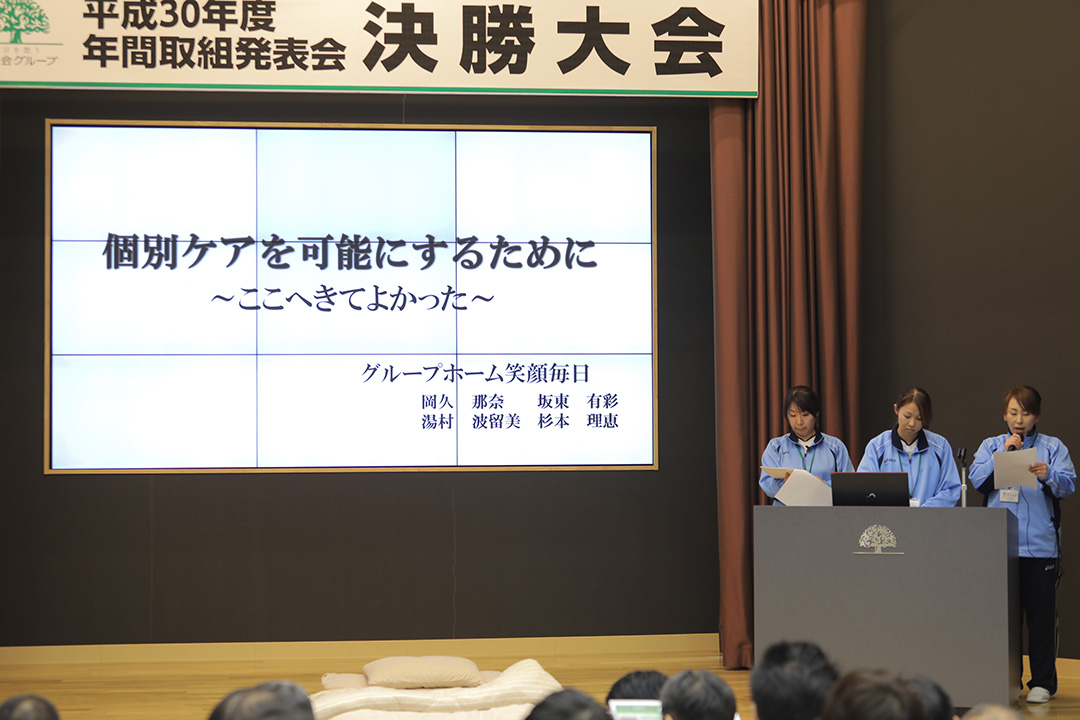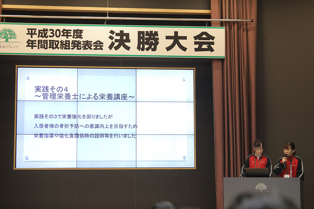 1年間の取り組みの成果発表の場として、本部経営戦略推進部と施設サービス力向上委員会、食・栄養向上委員会が主催して、年度末には年間取組発表会が開催されています。