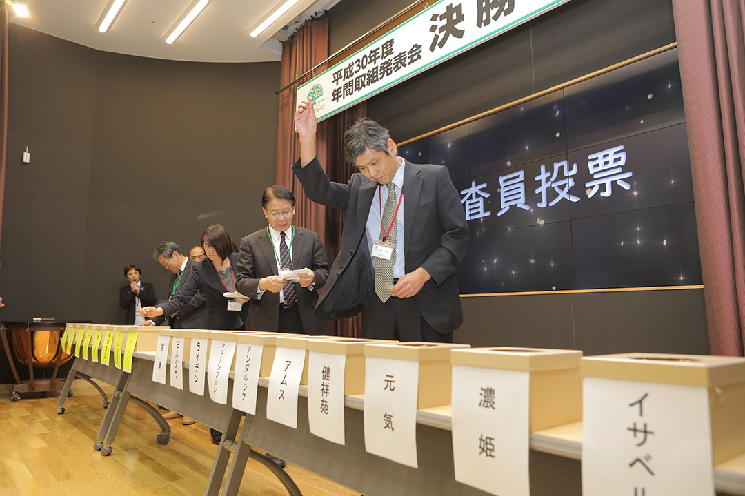 会場中が固唾を飲んで見守る中、コインがカウントアップされ、最後まで残ったのは、特別養護老人ホーム緑風会イサベル「笑顔の花を咲かせましょう!生涯安心を目指して」。17票獲得で優勝です。準優勝は15票獲得した老人保健施設健祥会ハート「地域に選ばれる老健を目指して〜多職種協働のチームワークこそハートの強み〜」。さらに3位には、10票獲得した老人保健施設健祥会ウェル「在宅復帰に向けての自立支援」と介護老人福祉施設ふるさと那賀「科学的介護で母への想いをかたちに〜胃ろうゼロへの取り組み〜」が選ばれました。