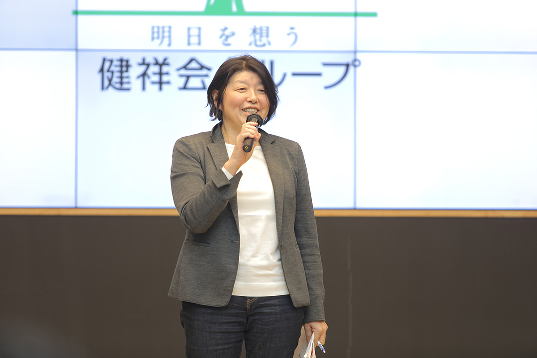 本部長中村晃子、校長武田英二に続き、川名佐貴子編集長も講評。本部長は、取り組み結果を生かしたケアの標準化とICTやロボット技術についてのデータ分析への今後の期待を語り、校長は、導き出された客観的事実を他施設でも積み上げて検証してほしいこと、また自身も関わるサルコペニアやフレイルの共同研究に触れ、健祥会グループからの発信の礎が築かれつつあることなどを喜ばしく語りました。川名編集長からは、「年間テーマのサブタイトル、『データ分析から利用者様の笑顔に』は、介護報酬の流れからして非常に時宜を得たテーマであり、多職種が連携していくには共通言語であるデータによる納得が非常に重要であることから、全施設によるこうした取り組みは素晴らしい」と評価いただくとともに、「今後ICTの導入をさらにすすめることによりデータ化も容易となり、ものの見方も変わるだろう。発表者はレーザーポインターを使いながら、会場の視線とやりとりしながらすすめることができればさらに良い発表となる」というアドバイスもいただきました。