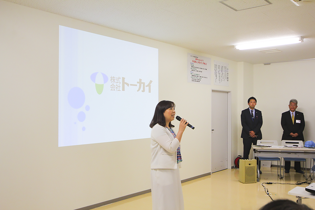 まずは、株式会社トーカイ様での会社見学。職員の方々がわざわざ出迎えてくださり、リラックスして見学スタート。リネンを取り扱う工場内は非常に衛生的で、異物混入などの事故防止に繋がる努力をされており、私たちの現場の危機管理の参考になりました。職場環境も美しく清潔に整えられていました。