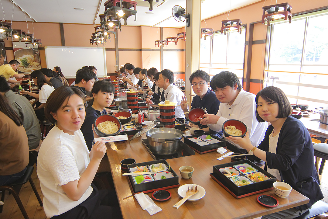 賑やかに盛り上がった中野うどん学校でのうどん打ち体験。自分たちで打ったうどんはおいしくて、3杯食べたツワモノも!