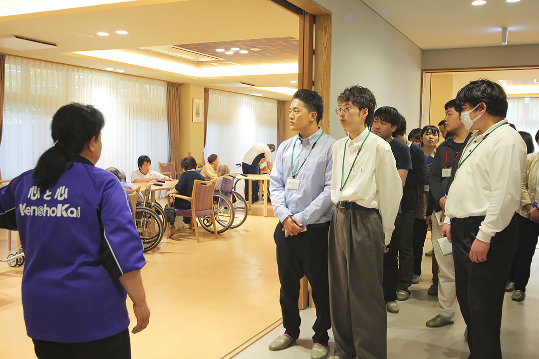 健祥会バーデンでの施設見学は、自施設とは違う種別の施設で、様々な職種の職員の仕事ぶりや介護の実態を間近に学ぶ機会となりました。風呂場やトイレの設備は、利用者様の身体状況に合わせて整えられており、一人ひとりに合わせた細やかな介護が行われていました。