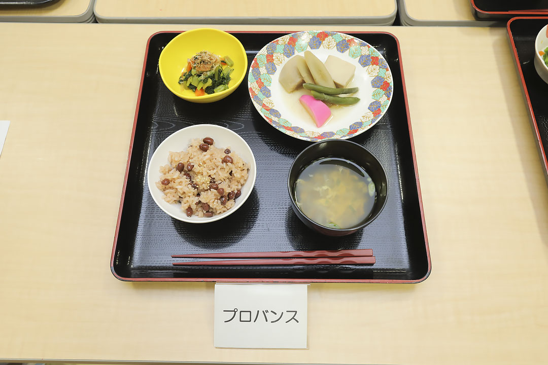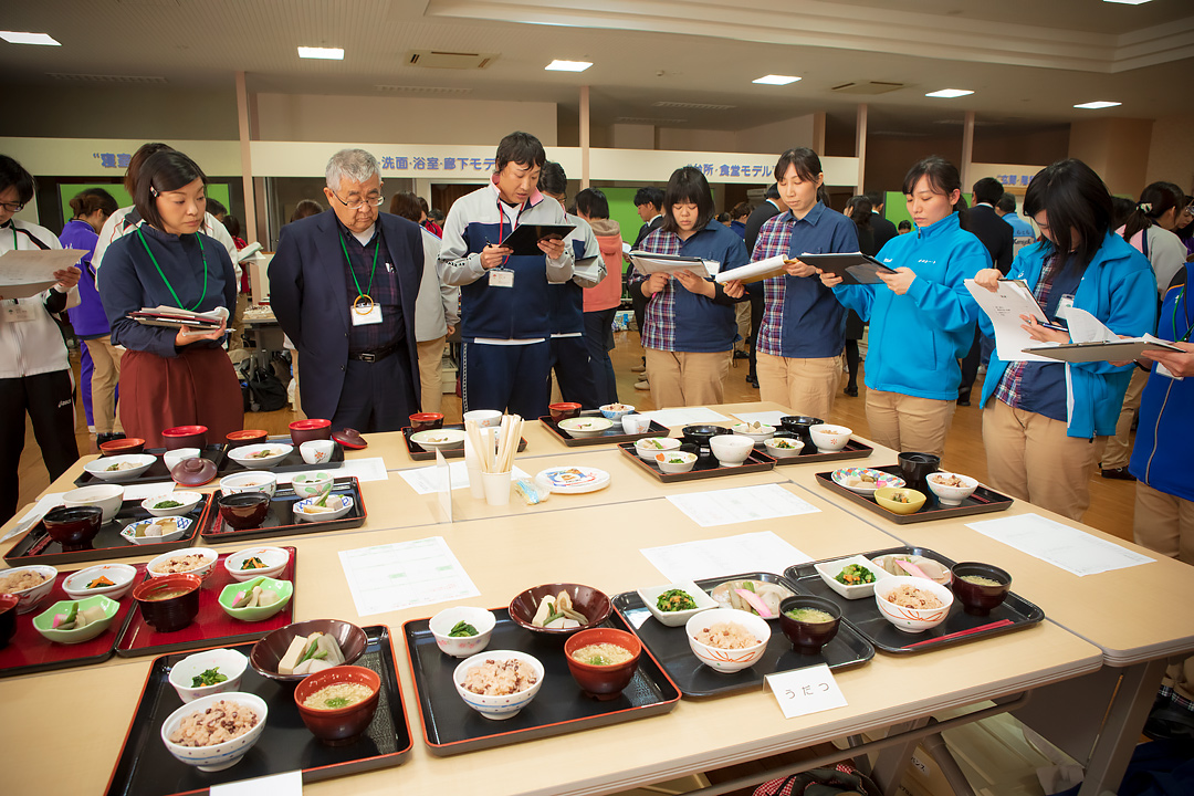 今年も、徳島・高知・香川県内の32施設が、健祥会プレゼンテーションにあらかじめ定められたテーマに沿った料理を持ち寄り、コンテストが開催されました。テーマは、統一献立(赤飯・煮しめ・お浸し・お汁)、便秘予防・改善献立、免疫力アップ献立、鶏むね肉をつかった洋食献立の4つです。